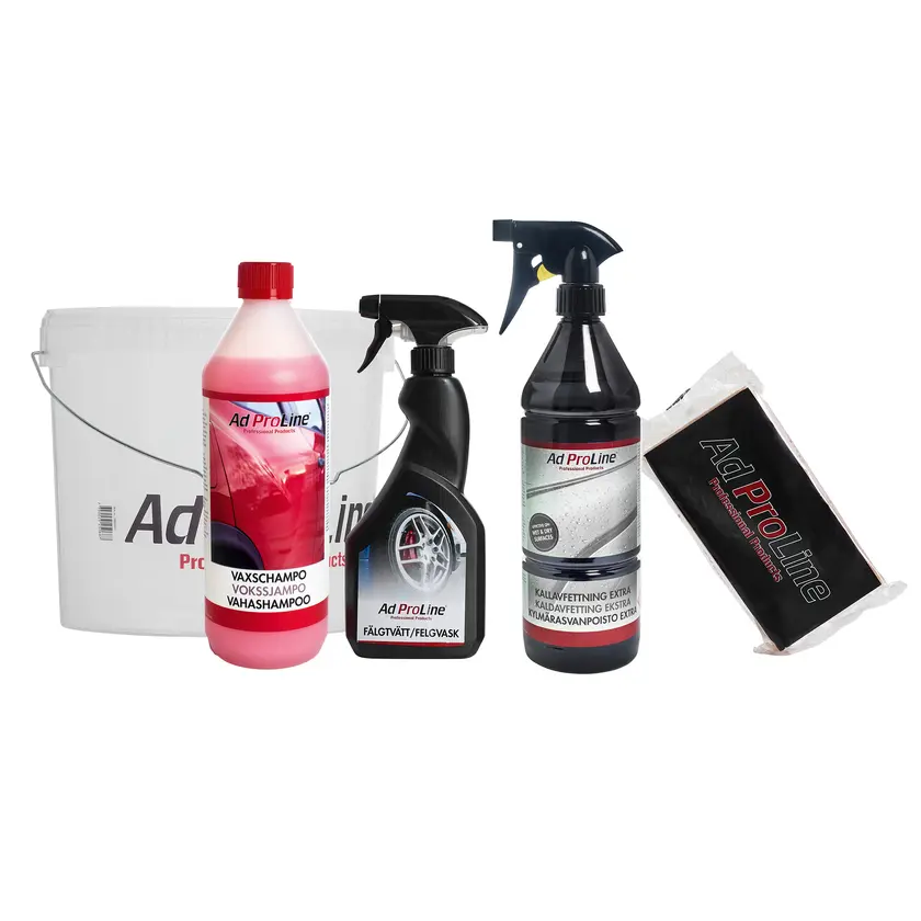 Hinken innehåller:1 st Hink med återförslutningsbart lock1 st Tvättsvamp1 st Vaxschampo, 1 l1 st Kallavfettning Extra, 1 l spray1 st Fälgtvätt, 0,5 l spray